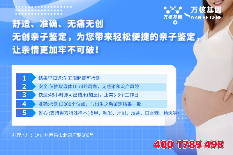 凉山个人亲子鉴定办理地址:凉山州西昌市北碧府路606号(如需办理,需提前预约)预约电话:4001789498,服务地区包括:西昌市、盐源县、德昌县、会理市、会东县、宁南县、普格县、布拖县、金阳县、昭觉县、喜德县、冕宁县、越西县、甘洛县、美姑县、雷波县、木里藏族自治县等周边城市,可在线咨询:无创产前亲子鉴定、司法亲子鉴定、移民亲子鉴定、入户亲子鉴定、中考亲子鉴定、高考亲子鉴定、凉山个人亲子鉴定等等咨询服务。